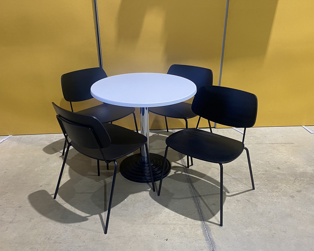 Used round canteen table with a white Werzalit top, chrome column stand and a black metal base. The chairs have a wooden seat and back finished in black with a black 4 legged metal frame.