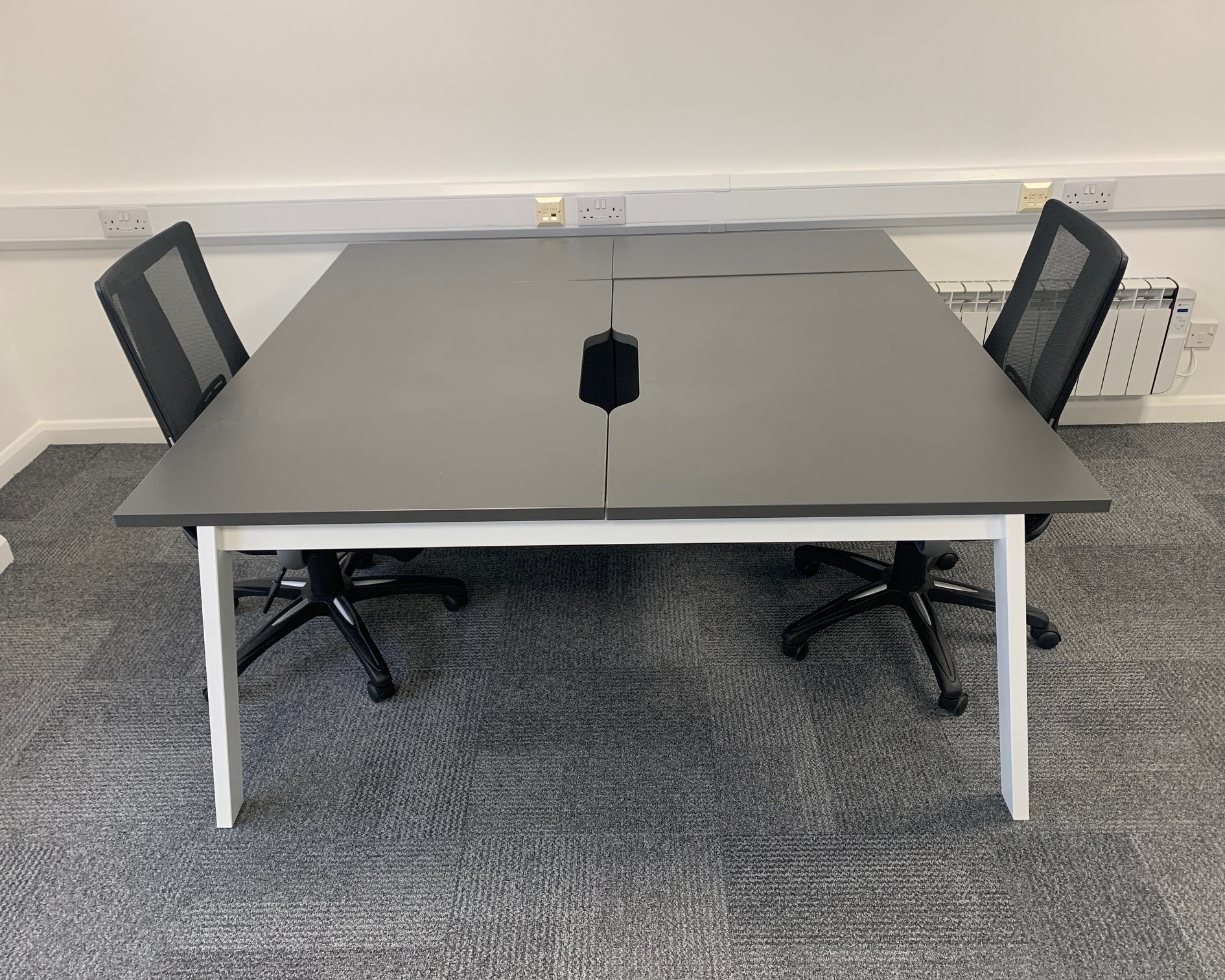 Although listed as second hand, they’ve been sitting in an unused office for 2 years so they’re like brand new. The matching drawers are desk high so sit at the end of the desks extending your workspace. The desktops are finished in a dark grey melamine with scallop cut-out cable access sitting on white metal legs. The desk high drawer units are finished in white with a matching dark grey top. The pedestals consist of three drawers, 2 x standard drawers and 1 x filing drawer. There is also a matching meeting table and desk high cupboards to match the desks.