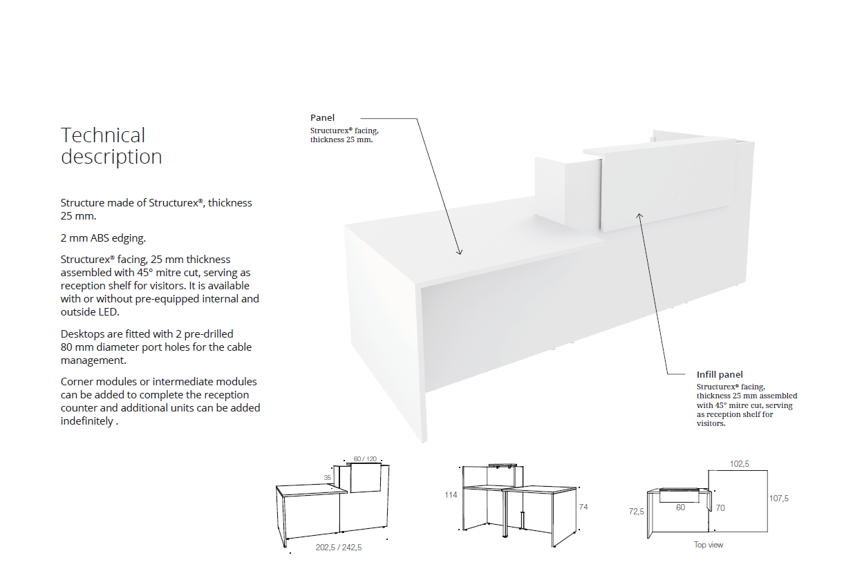 Structurex® facing, 25mm thickness assembled with 45° mitre cut, serving as reception shelf for visitors.