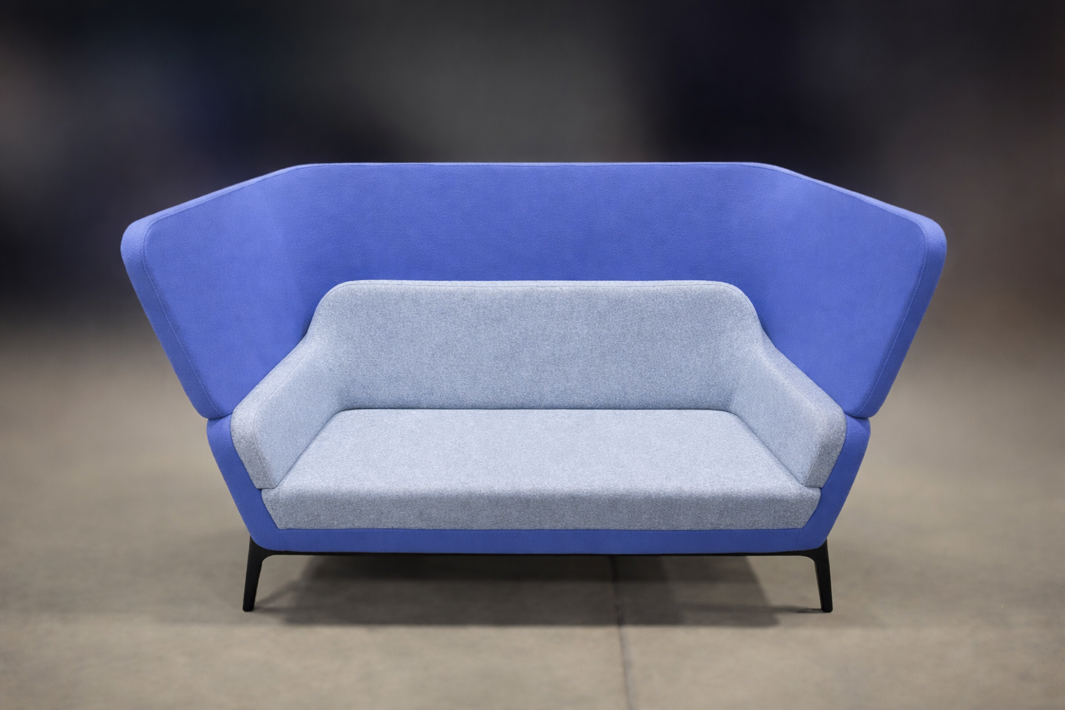 We’re pleased to offer this high sided sofa from our used range. The sofa is finished in a two tone blue fabric giving it a stylish look. The wrap around back and sides are finished in a mid-blue with the seat, arms and lower back finished in a light blue. The sofa is supported on a black wooden four legged frame.