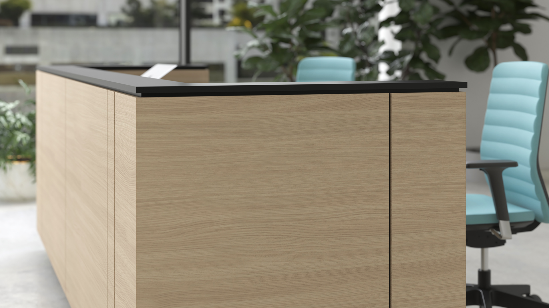 Depending on your vision for the interior, choose between either a melamine or luxurious veneer finishes in a range of colours. Using the same finish on the top, base and front will create a solid and minimalistic reception unit, which will be as clean and smooth as ice. On the other hand, introducing a different coloured top or decorative inserts, allows you to subtly integrate the reception unit into your office environment.