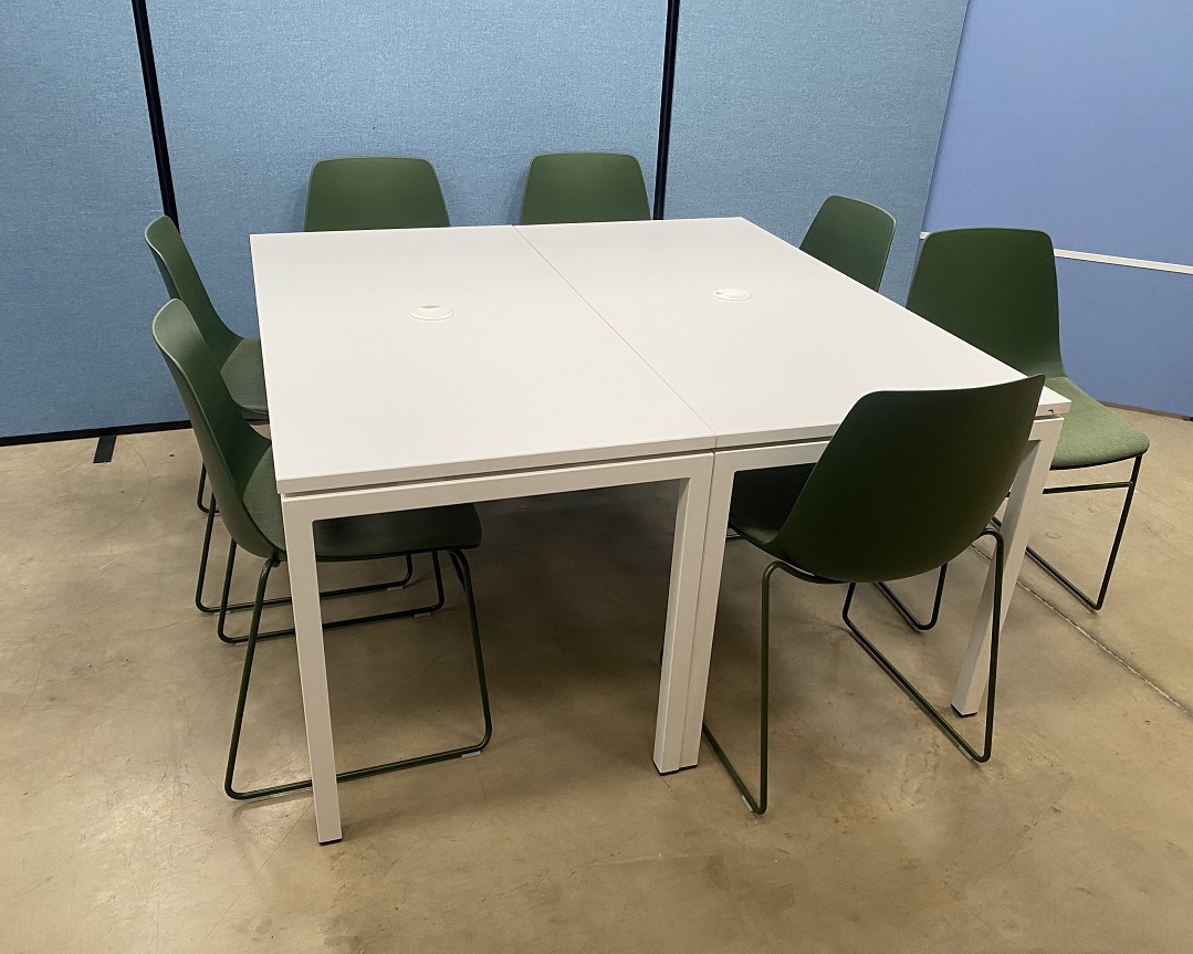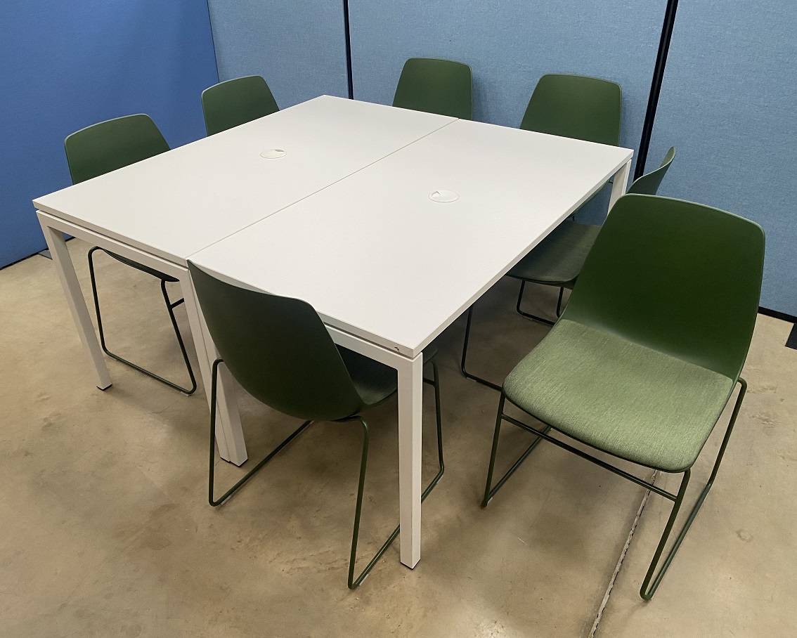 The table comprises of two rectangle tables, each having a centrally placed cable access port. The tables are picture with the Boss meeting chairs, enough room to comfortably seat 8 persons. For more information on the chairs, please “click here“. Alternative chair options also available.